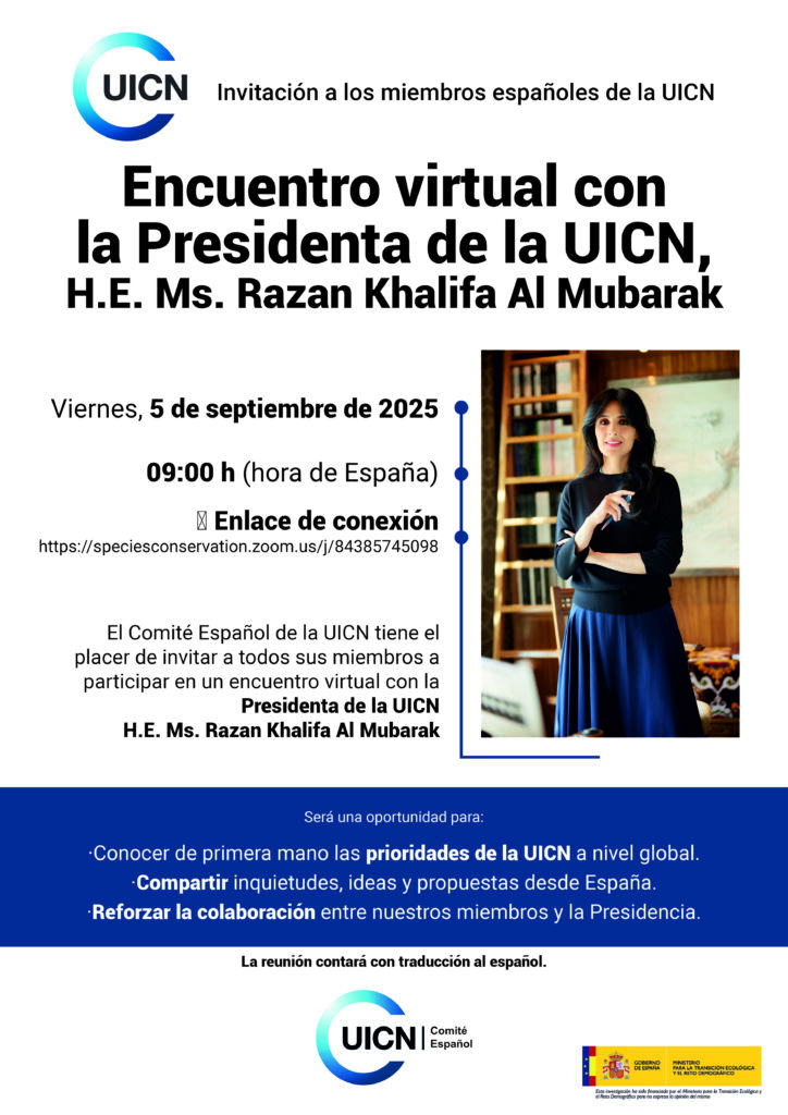 El Comité Español de la UICN tiene el placer de invitar a todos sus miembros y público interesado a participar en un encuentro virtual con la Presidenta de la UICN, H.E. Ms. Razan Khalifa Al Mubarak, que se celebrará el próximo: