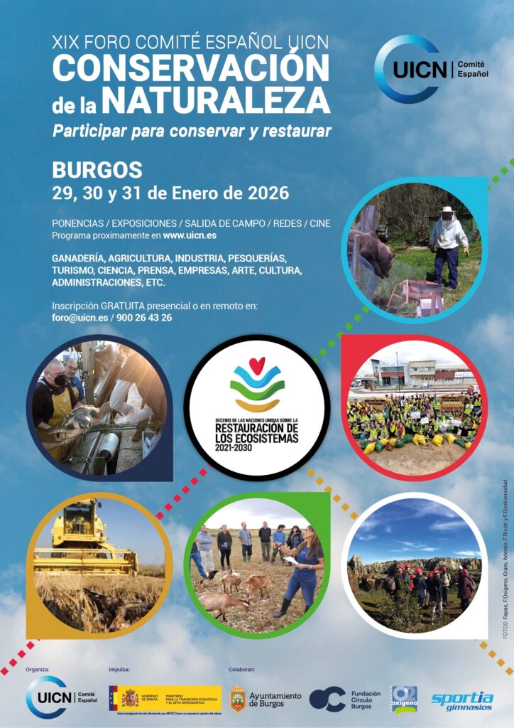 El XIX Foro de Conservación de la Naturaleza del Comité Español de la UICN se celebrará en Burgos del 29 al 31 de enero de 2026 bajo el lema “Participar para conservar y restaurar”. Esta nueva edición, organizada en colaboración con la Fundación Oxígeno, la Fundación Círculo y el Ayuntamiento de Burgos, con el apoyo del MITECO, reunirá a administraciones públicas, entidades conservacionistas, universidades, empresas y ciudadanía para reflexionar sobre cómo fortalecer la implicación social en la restauración de los ecosistemas. A lo largo de tres días se presentarán proyectos y estrategias que muestran cómo la acción conjunta —entre lo rural y lo urbano, lo público y lo privado— puede contribuir a recuperar la naturaleza y a construir una sociedad más comprometida con la sostenibilidad.